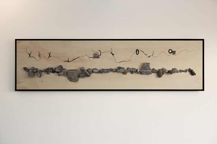 Le tableau est composé de cailloux ramassés lors de randonnées et choisis pour la ligne de quartz ou de calcite qui les traverse. Formée naturellement du fait des pressions auxquelles les roches sont soumises, les diaclases sont des fractures dans la roche dont les parties disjointes ne s’éloignent ni ne se décalent les unes des autres. Au fil du temps, l’eau s’infiltre dans les diaclases, y dépose du calcium et du calcaire qui se recristalisent et forment ces lignes blanches “parfaitement droites”. Maintenus en tension les unes à la suite des autres par des clous, les pierres forment sur le plateau de bois une ligne d’horizon ramenant à l’échelle du temps géologique. L’installation pousse naturellement à se rapprocher invitant le spectateur à suivre la ligne comme il suivrait l’un de ces “sentiers invisibles”.